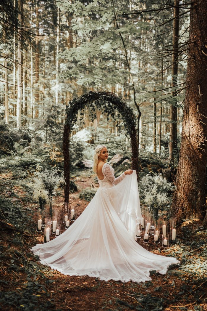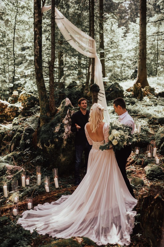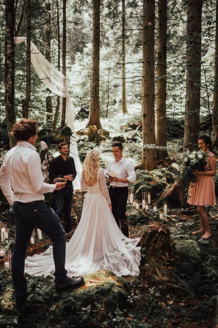 Next, the venue! Set a romantic mood for your elopement wedding with an indoor-outdoor ceremony and reception. A dappled forest makes for stunning “I do” photos, while a nearby barn, lodge, or private estate offers the perfect evening respite for your wedding party and guests to relax and celebrate. Woodland weddings are especially conducive to candlelit backdrops and fairy lights, which add warmth and dimension to shady undergrowth or meadow wildflowers. Keep your ceremony arch simple (the forest is your chapel!), and optimize your seating arrangement for your guests’ comfort and view.