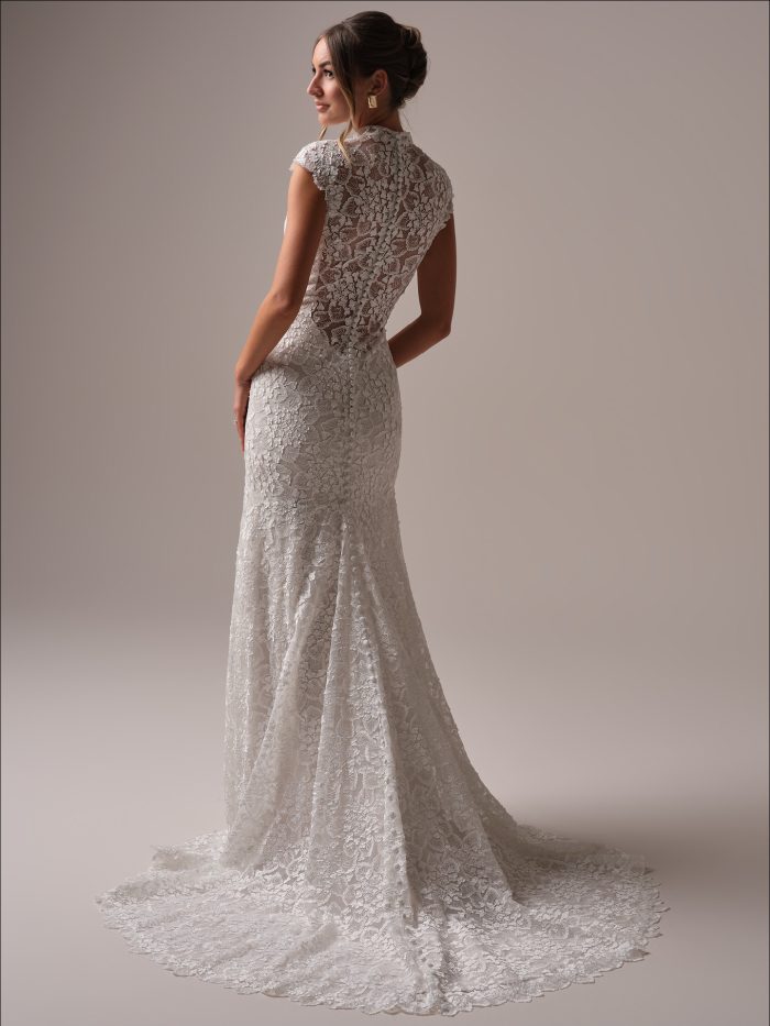 - Auburn by Maggie Sottero is all about the sleek silhouette and high neck bodice. The all-over lace is an ideal fusion of classic and boho aesthetics — it’s incredibly timeless, yet chic, modern, and sophisticated for a fabulous summer wedding.