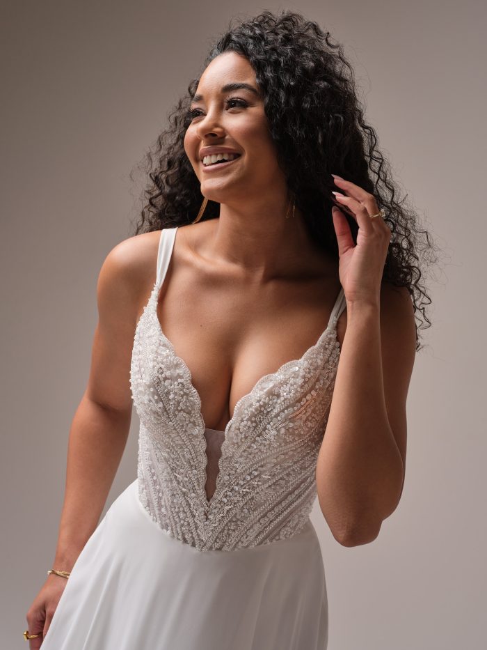 - Natalie by Maggie Sottero features a sexy form-fitting bodice with a unique plunging neckline and illusion details. This style is perfect for summer weddings — lightweight, flirty, and so easy to style for an outdoor venue.