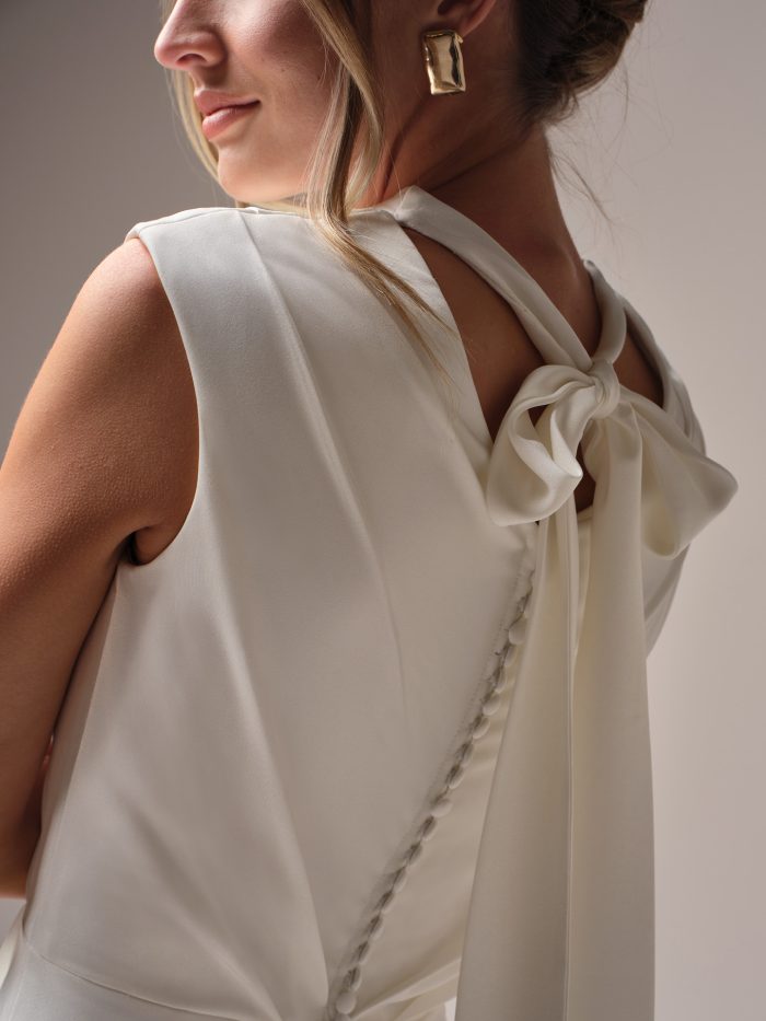 - Jett Leigh by Rebecca Ingram fuses Old Hollywood styling with effortless and elegant tailoring. The draped fabric is comfortable, the high neck is demure, and the form-fitting silhouette is chic and sophisticated. It’s an unforgettable fit for a confident yet stylish bridal vibe.